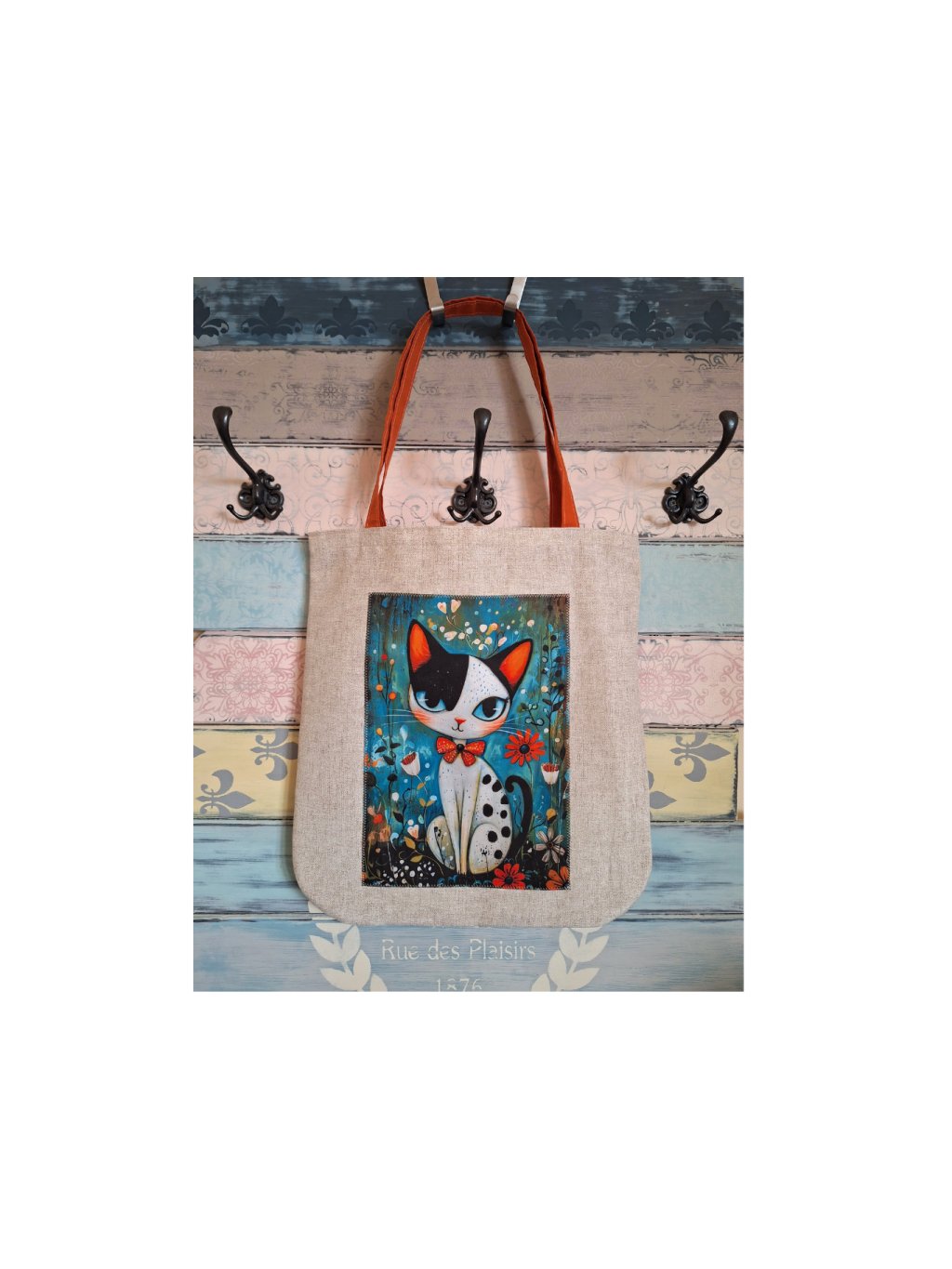 Tato je z české směsové látky režného vzhledu (70% bavlny, 30%polyesteru). Na jednu stranu jsem našila krásný panel s kočičkou a květinami.