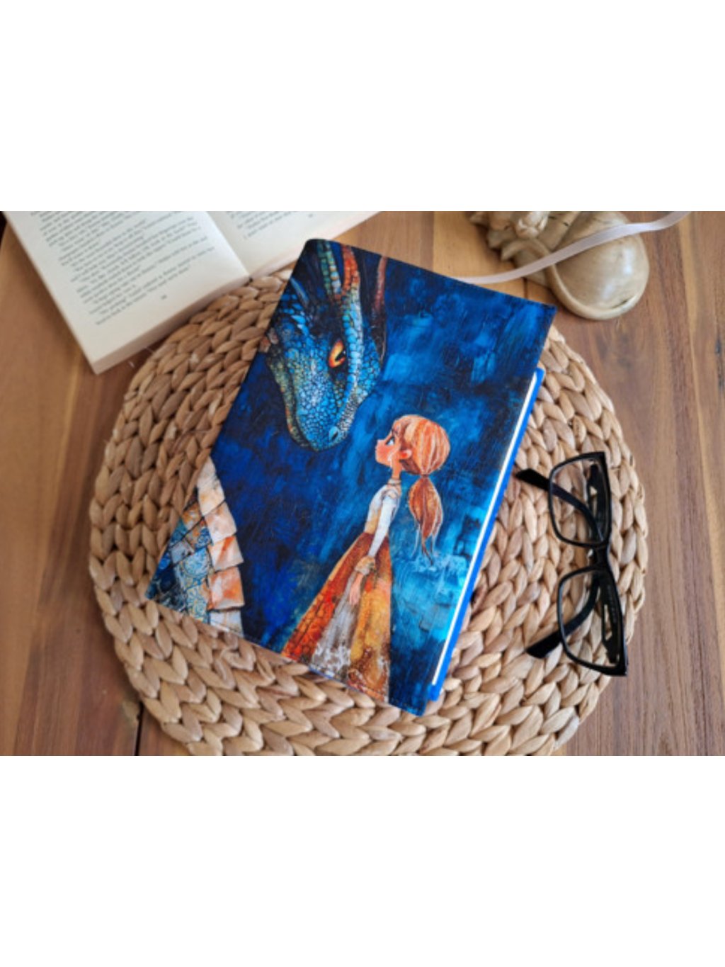 Látkový obal s motivem majestátního draka a odvážné dívky. Doplněno o tmavě tyrkysovou žíhanou látku.