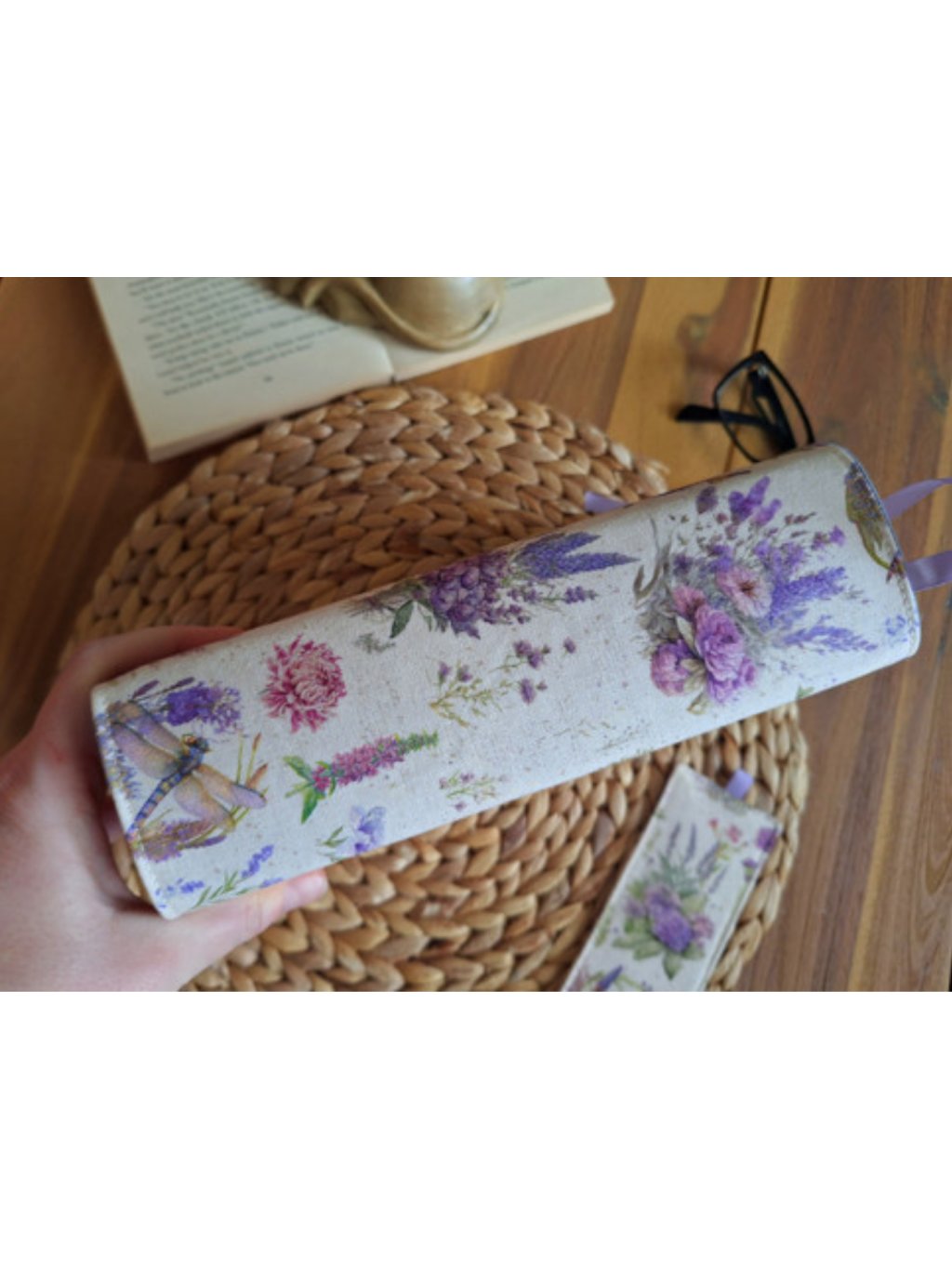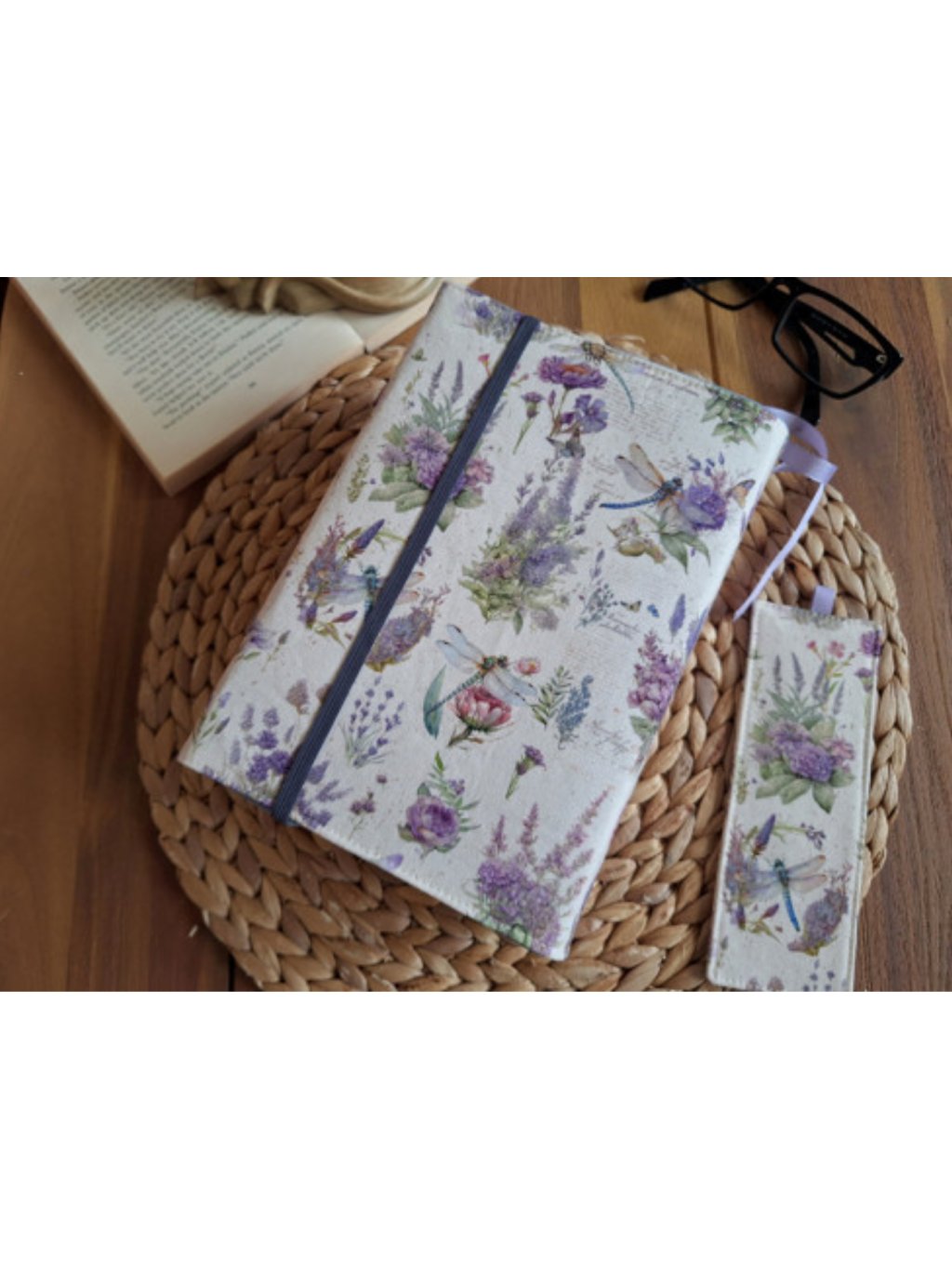 Látkový obal s romantickým motivem vážek, květin laděných do fialkova a téměř neviditelných textů. Podklad je světle režný (z fotek se zdá téměř bílý, ale barvička je skutečně spíš do béžova).
