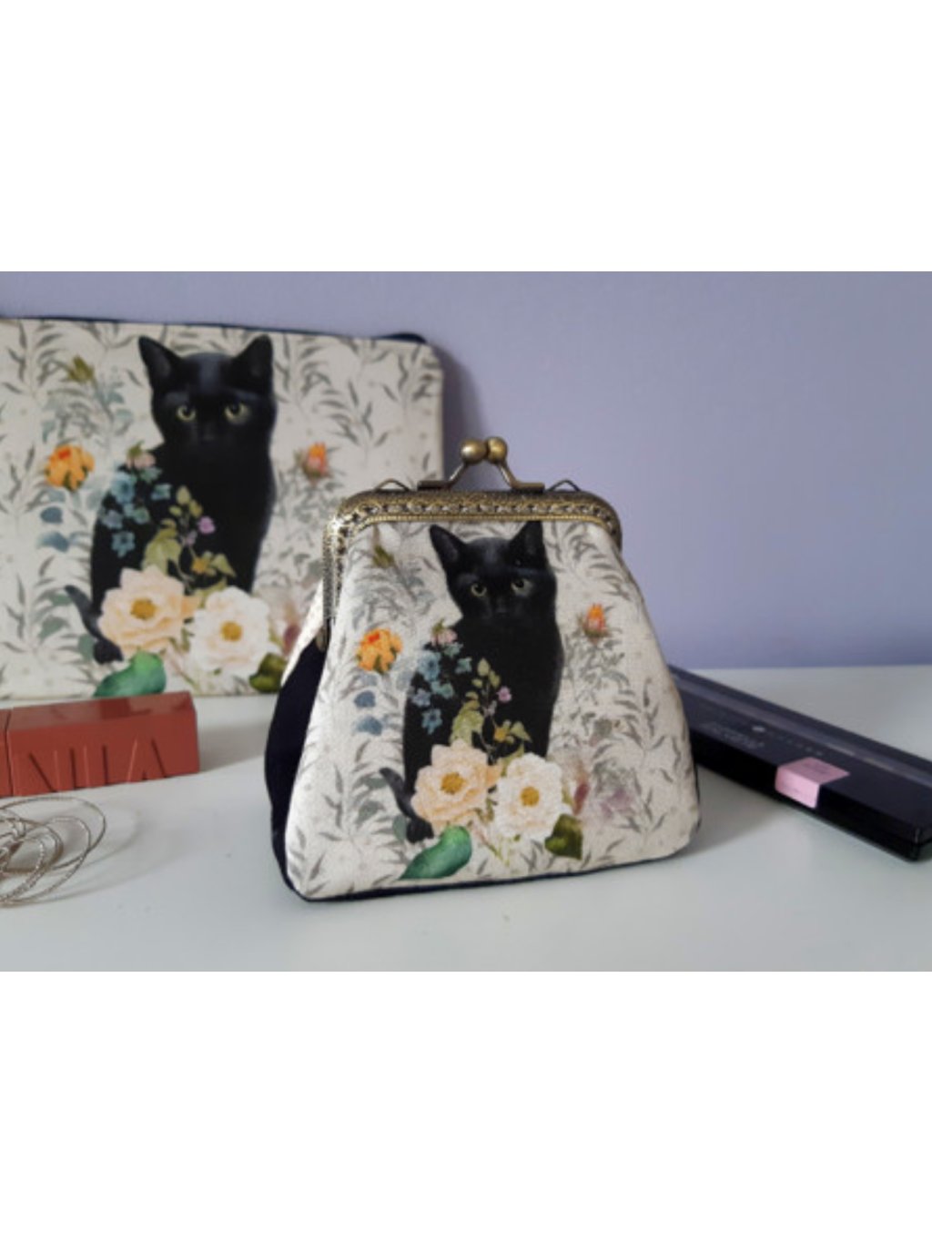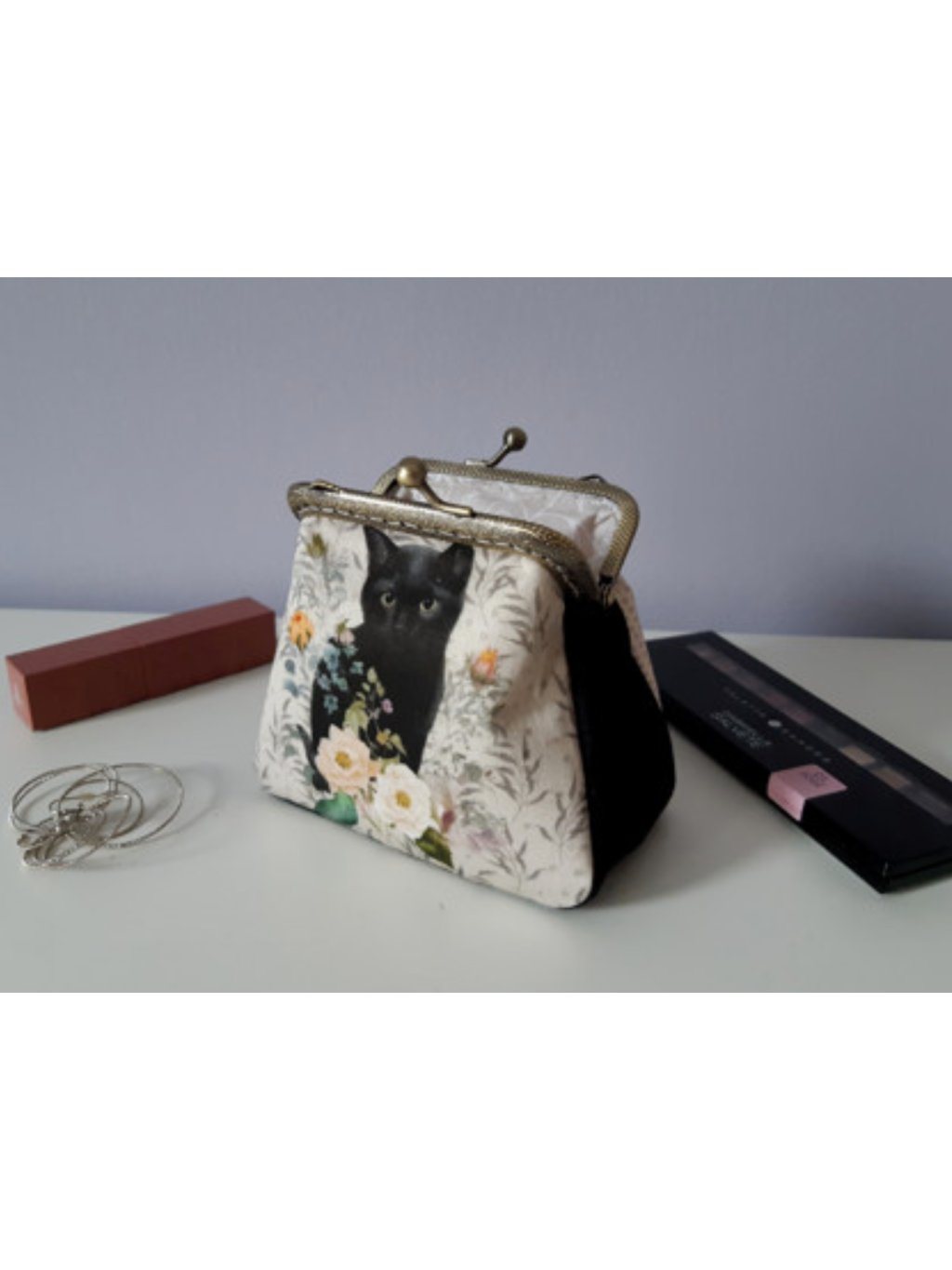 Taštičku jsem tentokrát ušila hned z několika látek - panelu s krásnou černou kočičkou a květy, světlé látky s drobným vzorkem laděné k panelu a černé látky na bocích.