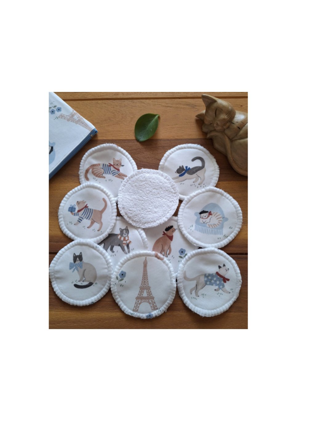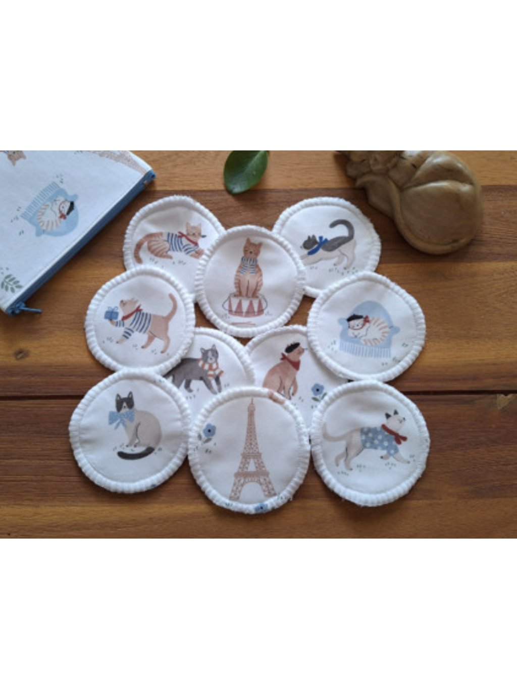 Tamponky jsou s roztomilými kočičkami v baretech, tričkách nebo šálách. Druhá strana je bílá. Kočiček je na látce celkem devět, desátý tamponek je s Eiffelovkou, která je samozřejmě vystřižená ze stejné látky. Pokud byste ale chtěli jenom kočičky a nevadilo by Vám, že se jedna bude opakovat, není problém připsat změnu do objednávky.