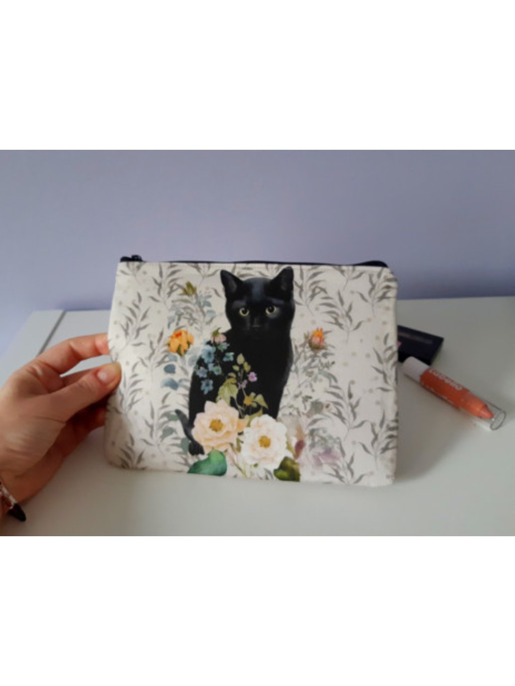 Nenechte se zmást názvem - malá černá je kočička, nikoli taštička, ta je naopak velká, šitá ze dvou látek plus podšívky. Na jedné straně je panel s kočičkou a na druhé straně je barevně podobná látka s drobným vzorem.