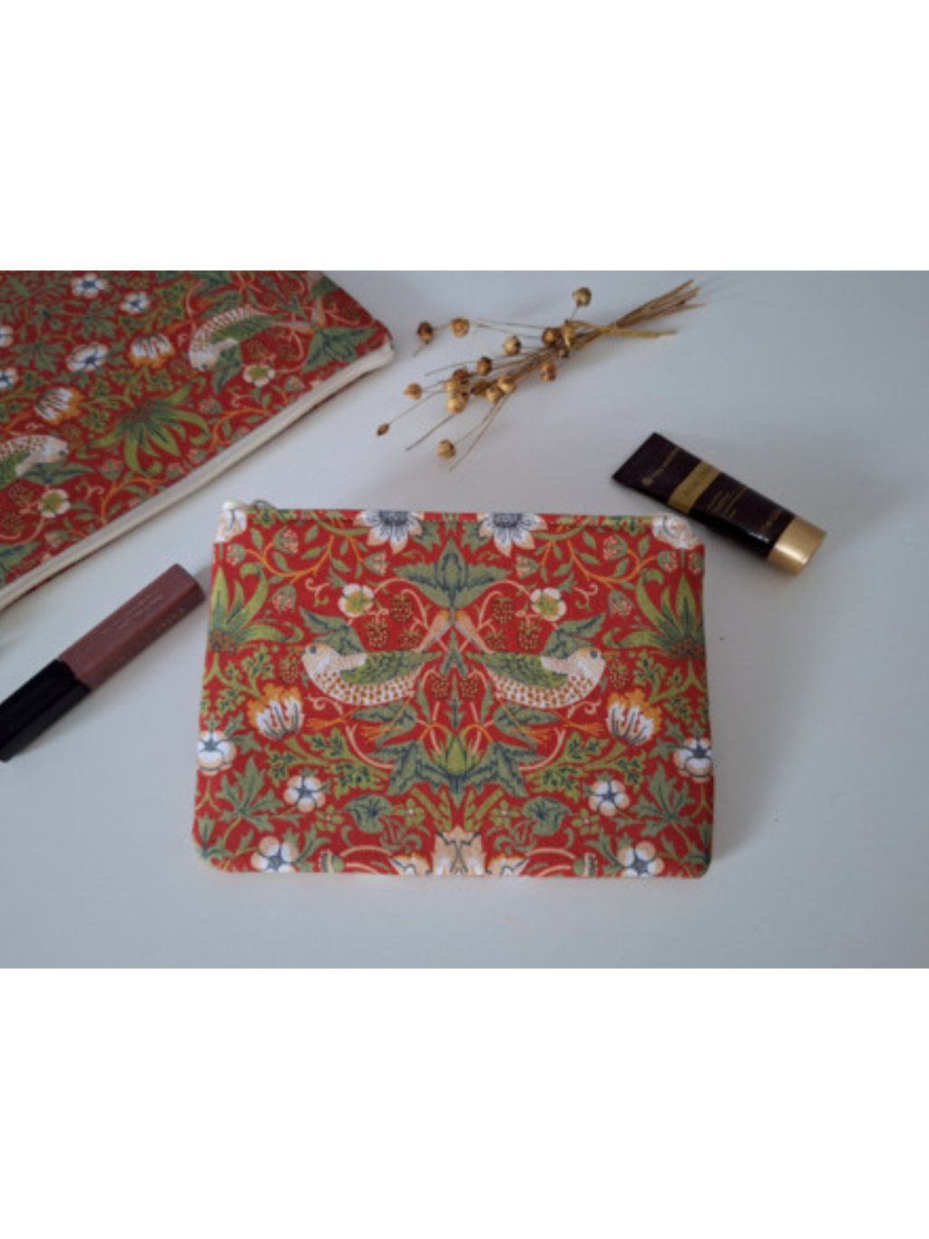 Tato taštička je starobyle přírodní - s ptáčky, jahůdkami, květinami a lístky, vše na krásně jahodově červeném podkladu.