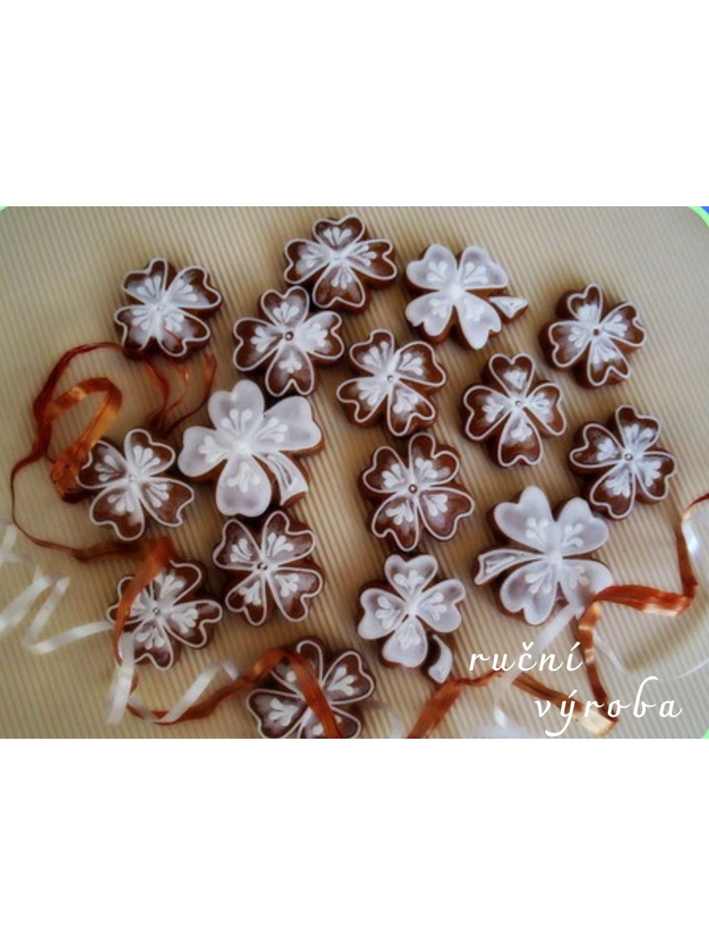 Největší perníček je 8 cm a nejmenší 5 cm. Barvičky čtyřlístků jsou odstínované.