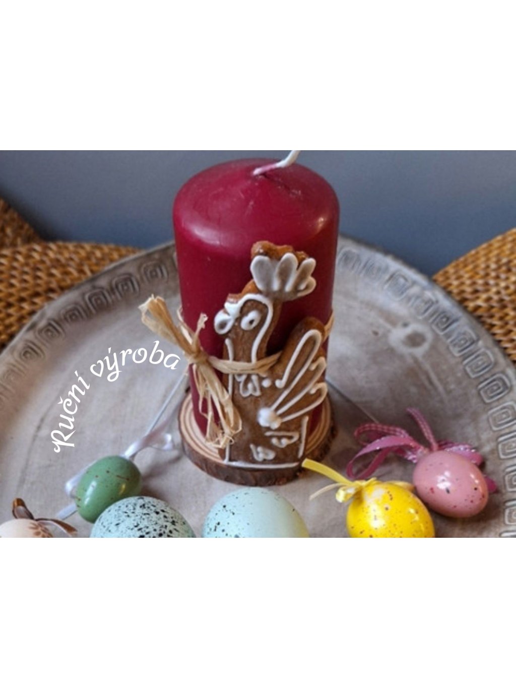 perníčky jsou okolo svíčky, kterou si můžete pořídit k výšce perníčku, podložka pod svíčku je dřevěná /já jsem koupila v Tedi , cena cca 100 Kč 8 kusů, svíčky seženete tamtéž také cca 50 Kč, provázek také cca 20 Kč klubko/, sestavení celého dárku je pak otázkou pár chvilek a dárky na velikonoce jsou hotové